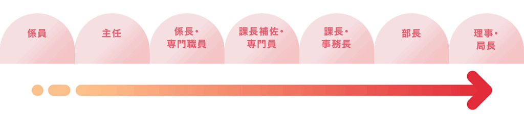 人事評価や選考等により昇任していきます。なお、職名は各機関で異なります。
